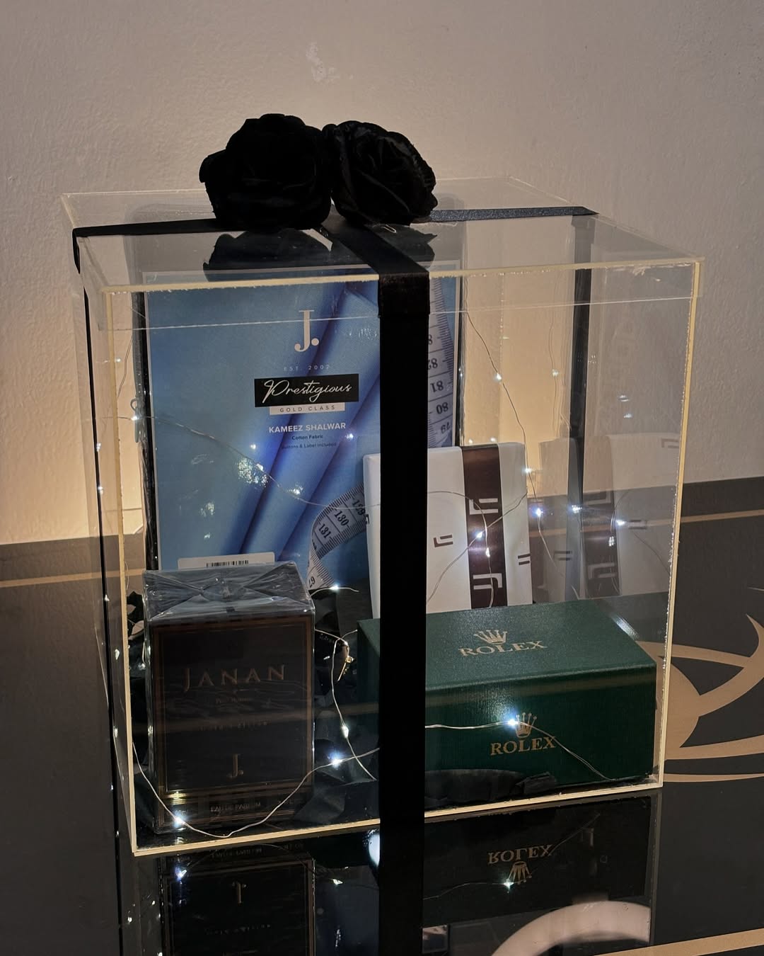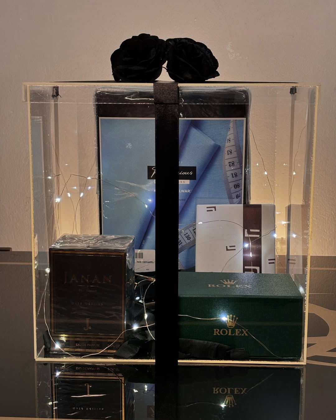 Elegance & Style: The unstitched suit and men’s watch offer timeless elegance, while the sunglasses add a touch of style and functionality.