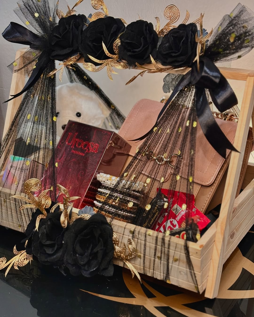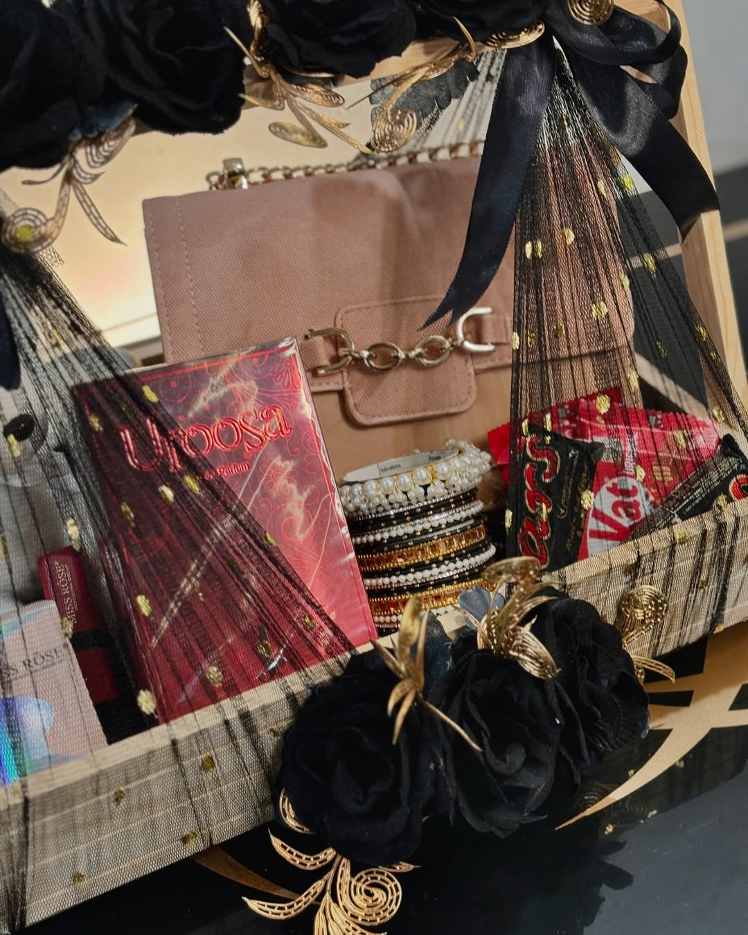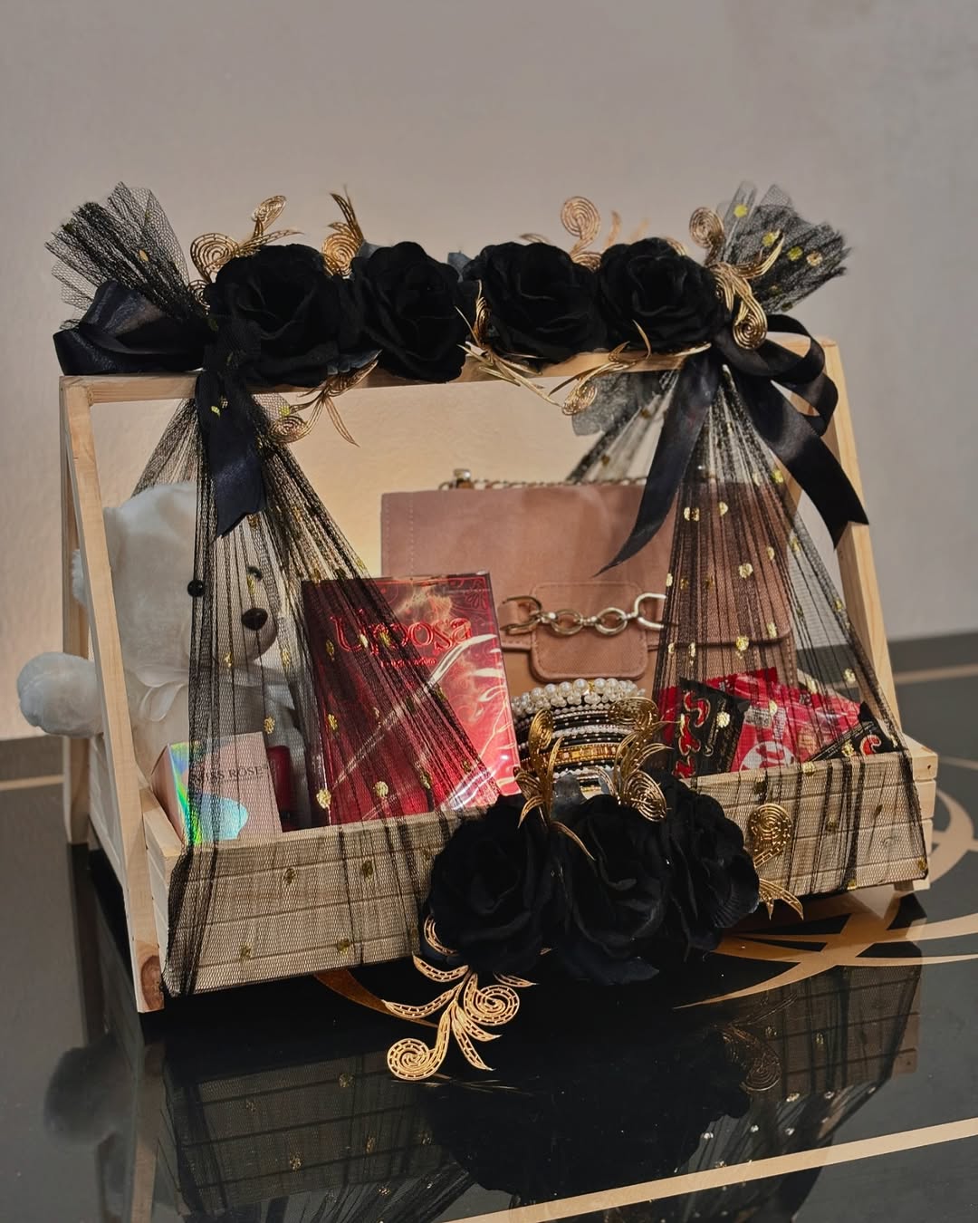 The Black Theme Gift for Her is a stylish and luxurious gift box, featuring a Limelight handbag, J. Uroosa perfume, a beautiful bangles set, a cuddly teddy bear, chocolates, and makeup essentials by Miss Rose — the perfect combination of fashion, beauty, and indulgence.